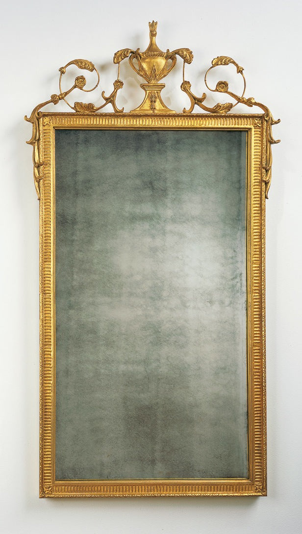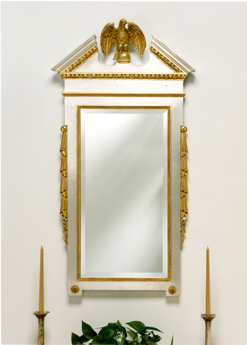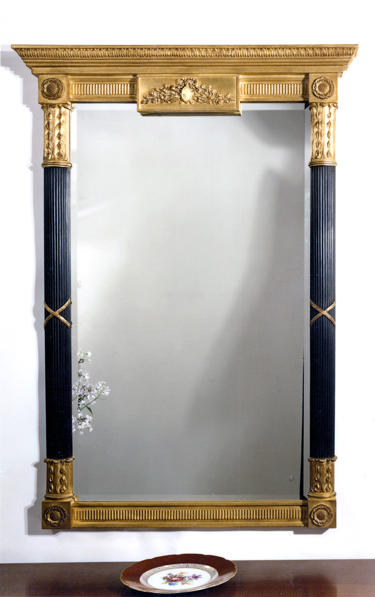 This mirror with its fluted shafts and block corner rosettes is perfect with American or...