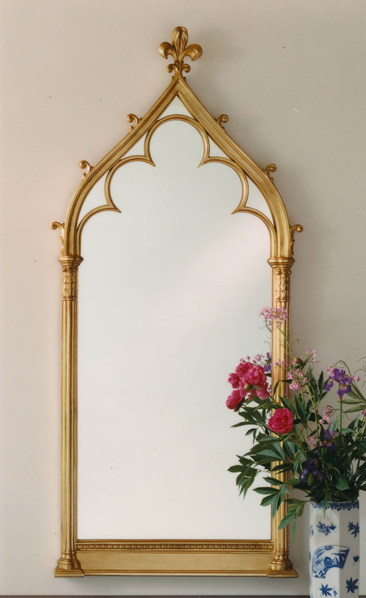 Quatrefoil fretwork traces the inside of this striking Gothic arch, topped with a royal fleur...