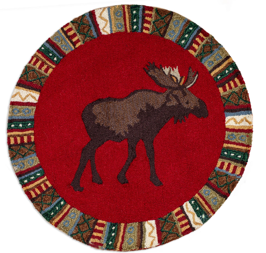 A striking decorative rug showcasing a majestic moose set against a vibrant red background with...