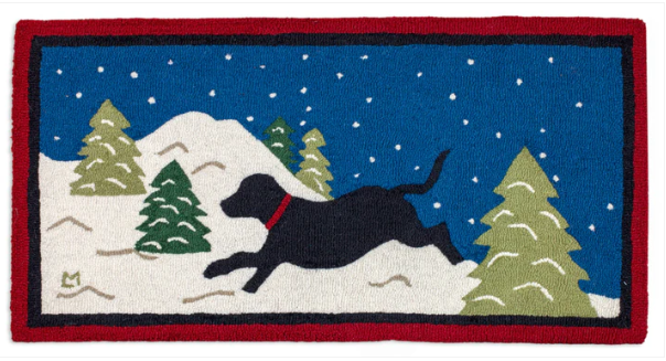 A charming decorative rug for dog lovers featuring a black lab joyfully running through the...