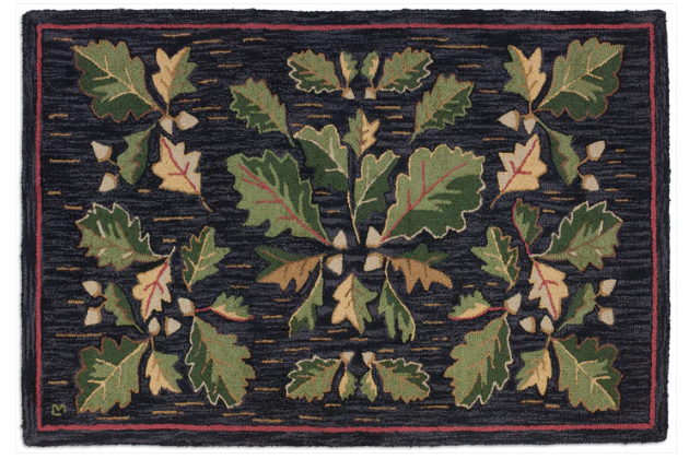 A lovely pattern of acorns and green oak leaves. This is a great small area rug for the cabin and mountain or country home. Warm rich lodge colors will beautifully embellish the entry, living room, or bedroom. Designed in Vermont by Laura Megroz.
