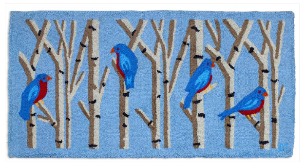 A welcoming rug for bird lovers showcasing a serene birch stand with blue birds boasting colorful red breasts perched among the trees.