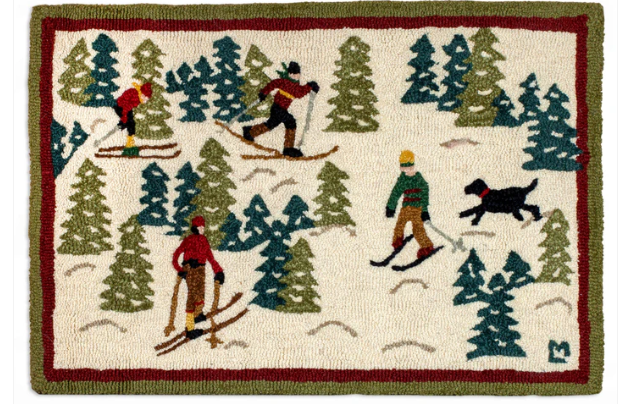 Skiers will love this scenic accent rug featuring skiers on a mountain slope surrounded by evergreens, snow, and a playful, free-roaming dog.