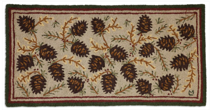 - Our Northwoods Cones - 2' x 4' rug has been hand-hooked with exceptional care by skilled craftsmen—providing a comfortable cushioning experience for your feet and are made with durable wool and a cotton backing for added strength and durability. The result is a premium decorative rug that adds a charming touch of handcrafted excellence to entryways, kitchens, hallways, bedrooms, living areas, and more.