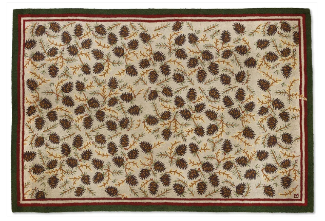 These pine cones are soft underfoot and add such a nice natural element. With a dark green border and a thin line of red just inside that, the whole design becomes one. Brown pinecones, green & tan branches and a khaki background makes this a great neutral toned rug. Designed in Vermont by Laura Megroz.