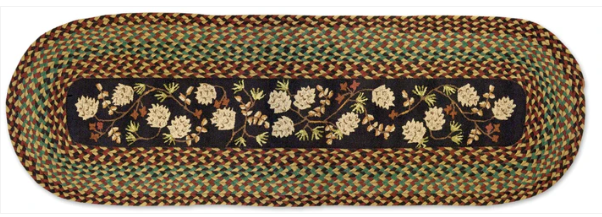 Bring vintage charm to a hallway with this wonderful hook 'n braid runner. A true depiction of a time gone by, combining hooking and braiding is an art. Pinecones running along a field of black with a stunning green, red, black and tan braided exterior. Designed in Vermont by Laura Megroz.