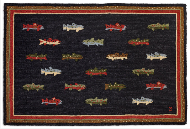A pattern of beautifully crafted and colorful trout and other river fish swim against a background of textured black. Bordered in soft red, taupe, and black this small area rug will decorate your entry, living room or bedroom of your country home. Designed in Vermont by Laura Megroz.