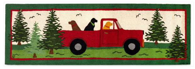 A whimsical rug runner for the pet lover featuring a vintage pickup truck, two dogs in the back, and a surprising driver ? another dog!