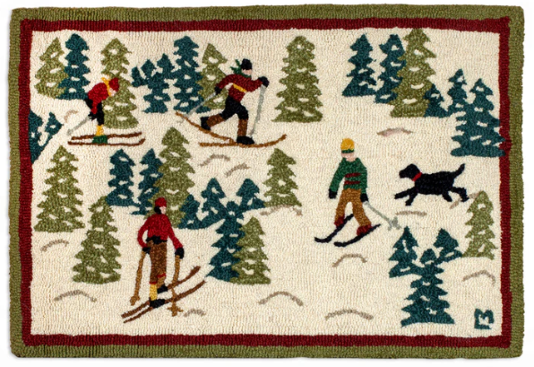 This rug is sure to be a favorite. Six skiers make their way down the mountain through pines on a snowy day. Whether it reminds you of that family ski trip you took last year or the trip you'd love to take in the future, this rug will add a little jump to your home. Designed in Vermont by Laura Megroz.