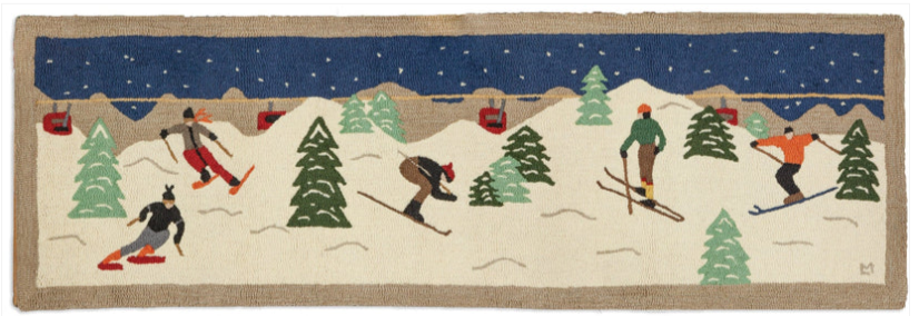 Enjoy fresh snow on a bluebird winter day at your favorite mountain and then bring home some of that fun with our Skiers on the Mountain hooked wool runner.