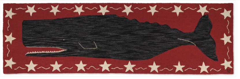 A fabulous black & gray whale beautifully rendered on this magnificent runner, surrounded by stars on a deep crimson field. Don't hide it away in a hallway, put in front and center in the kitchen, in front of the sliding glass doors or in front of the fireplace. Designed in Vermont by Laura Megroz.