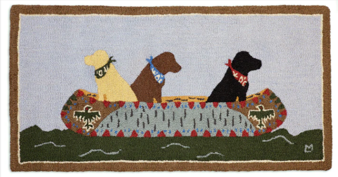 Three friends - a yellow lab, chocolate lab and black lab - in their Indian canoe on the lake with small whitecaps. What a timeless piece to have in your lake house to pay tribute to your four-legged friends. Designed in Vermont by Laura Megroz.