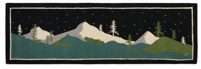 With snowcapped peaks towering over forested valleys this Winter woods hooked wool runner is a decorative rug that pays due tribute to the vast valleys of the rocky mountain west.