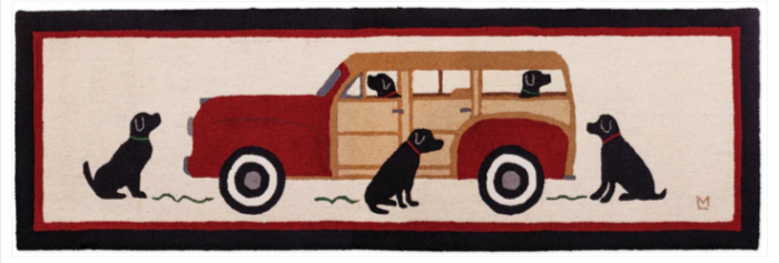 Honor your adventures with you favorite furry friends with this fun and decorative hooked wool runner rug depicting dogs in a wood paneled wagon.